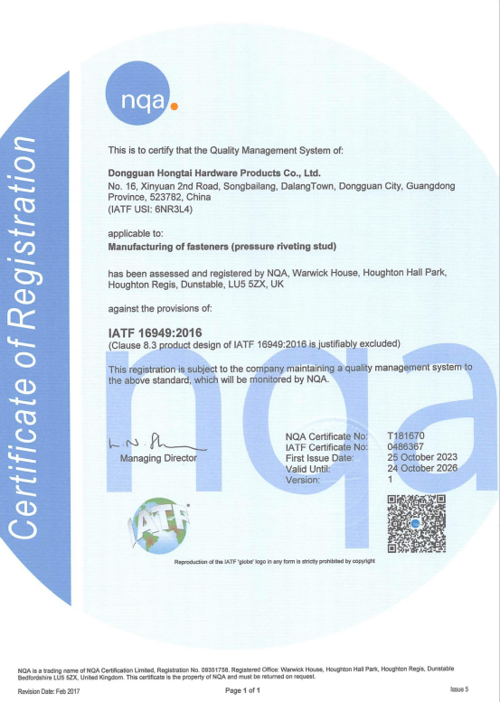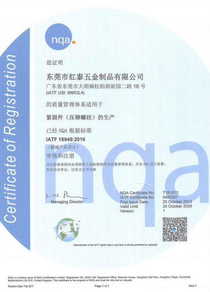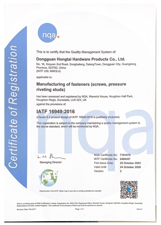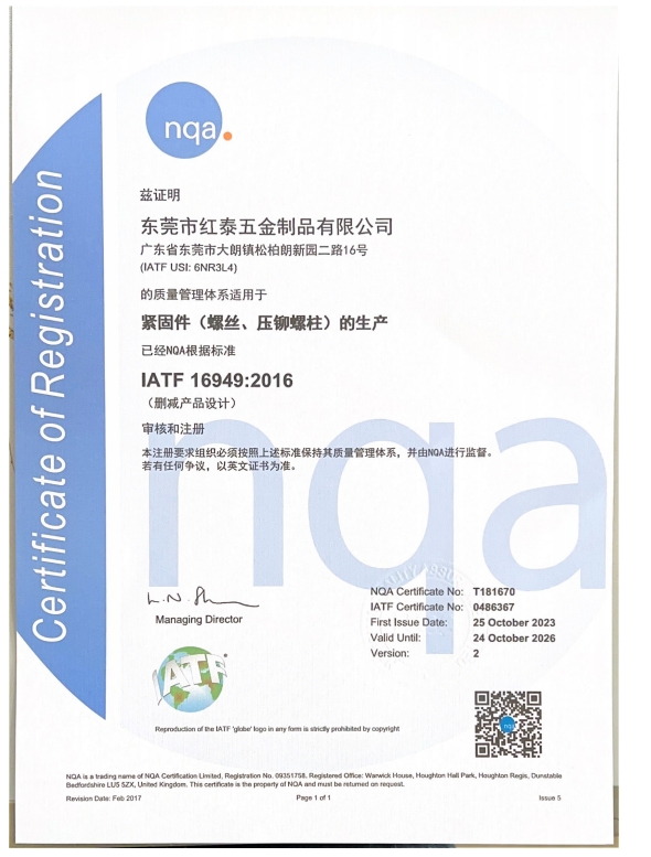 東莞市紅泰五金制品有限公司,公司占地六千多平方米,擁有五十多組螺絲機及六十臺自動車床設(shè)備。是一家專業(yè)設(shè)計、生產(chǎn)ISO、DIN、GB、JIS、ANSI、BS及客戶指定特殊要求的高精密五金緊固件的制造企業(yè)。